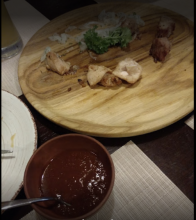 За перші 10 хвилин,що ми зайняли столик, офіціантка приходила 4 рази,хоч попросили почекати. Шашлик несли довго, коли принесли,то спитали,чи потрібен соус. В результаті соус принесли,коли шашлик був майже зїджений, хвилин через 40 (видно на фото). Цікавили деталі про салат з літньої пропозиції, офіціантка про нього нічого не знала. Чисто.